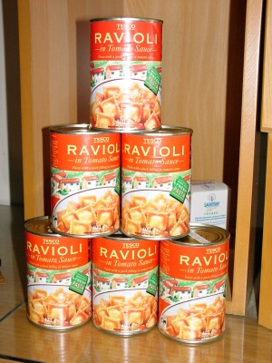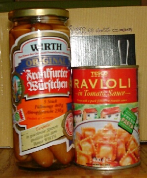 Orginal Frankfurter Würstchen ('Markenqualität aus deutschen Landen') auf orginal importierten italienischen Ravioli. |
